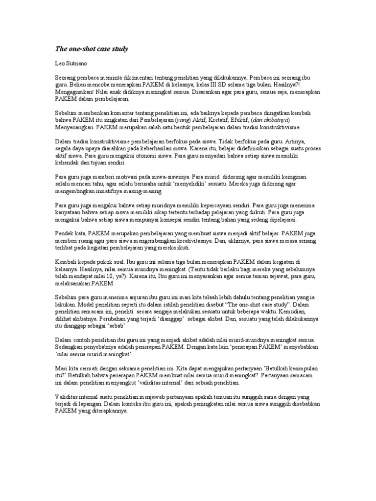 Contoh skripsi one shot case study. Berikut ini adalah contoh jurnal penelitian internasional gratis yang merupakan kumpulan file dari berbagi sumber jurnal penelitian internasional tentang jurnal penelitian yang menggunakan desain one shot case study pdf yang bisa bapakibu gunakan dan diunduh secara gratis dengan menekan tombol download biru dibawah ini. Adapun bagan dari one shot case study adalah sebagai berikut. Di antara beberapa strategi penelitian yang digunakan seorang peneliti kemungkinan kita akan menemukan apa yang namanya studi kasus case studies.