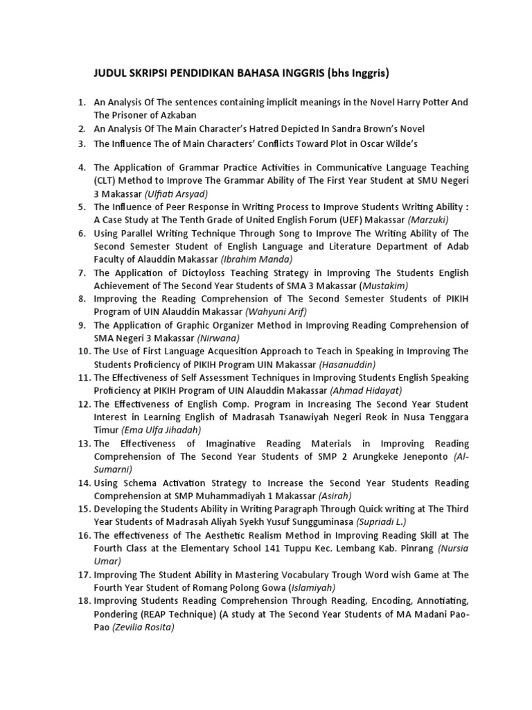 Ini adalah skripsi terbaik bagi temen temen yang senang dengan lagu lagu barat. Judul contoh skripsi bahasa inggris bahasa inggris adalah media komunikasi utama bagi masyarakat di negara inggris amerika serikat kanada australia new zealand afrika selatan dan di banyak negara lainnya. Berikut adalah daftar judul skripsi pendidikan bahasa inggris lengkap dan informasi skripsi pendidikan bahasa inggris.